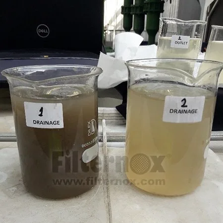 Filternox pilot filtrasyon sistemi görüntüsü Soldan sağa doğru- Filtre-1 giriş, Filtre-1 çıkış, Filtre-2 çıkış suyu numuneleri görüntüleri