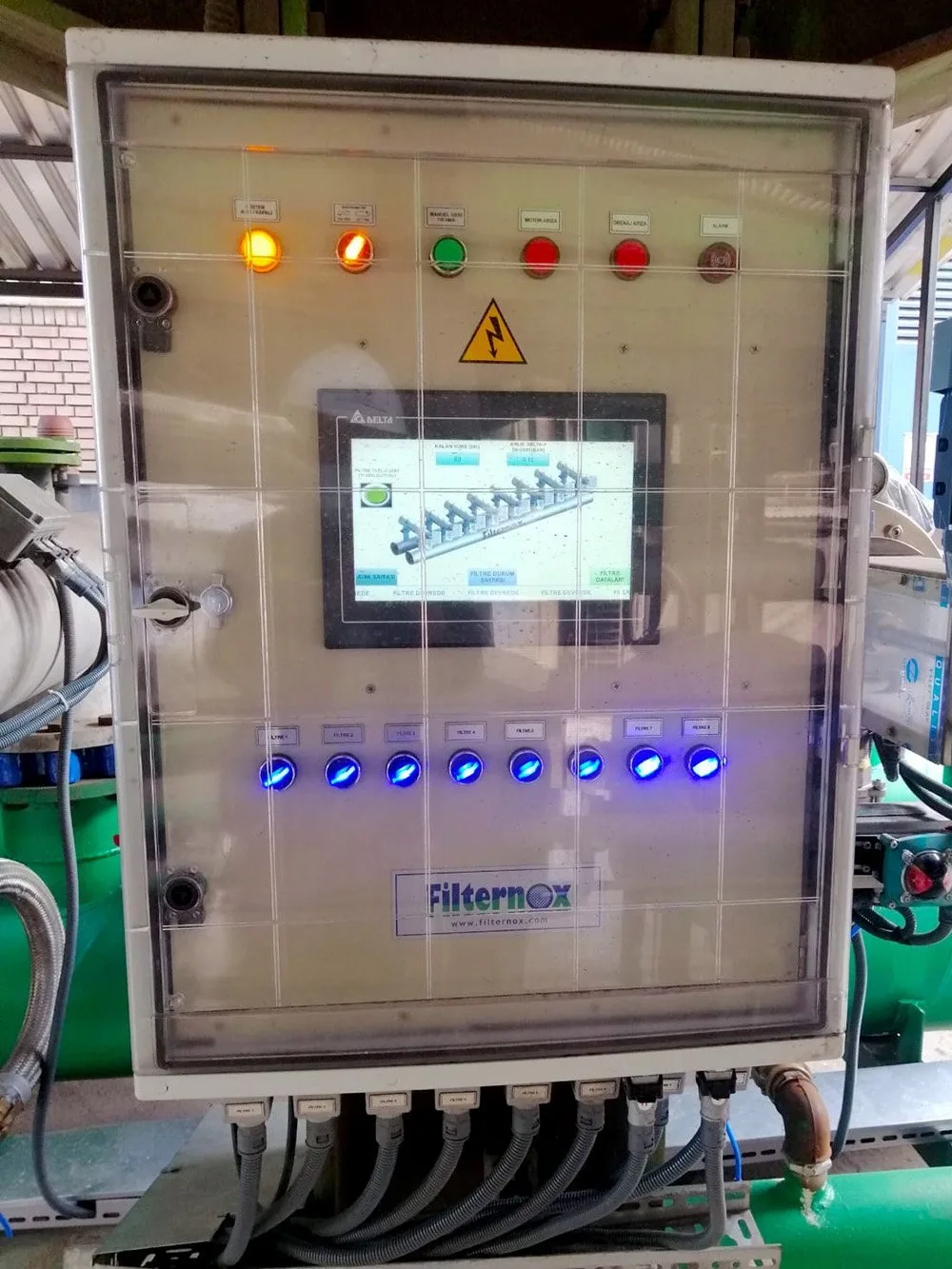 Kontrol Sistemi 10” HMI dokunmatik ekranlı ve Frekans değiştiricili PLC Kontrol Panosu & RS komünikasyon sistemine ve e-remote özelliğine sahip tam otomatik filtrasyon sistemi